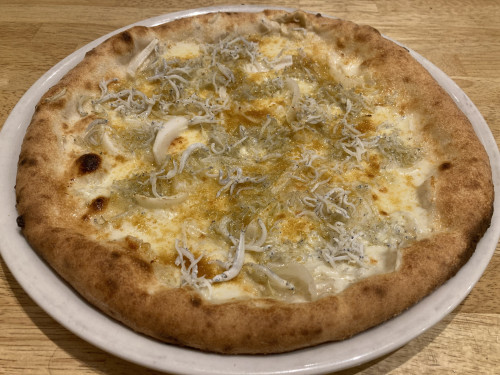 釜揚げしらすと新玉ねぎ、カラスミのピッツァ レモンの香り
